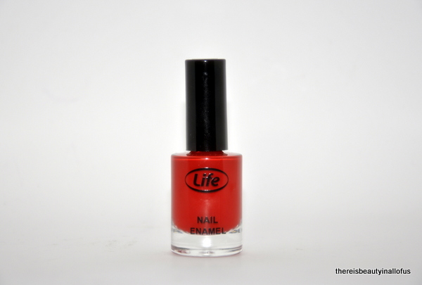 Life הוא לק אדום - עגבנייה קלאסי, מהסוג שכל אישה תשמח למרוח (באם אין לה סלידה ללק אדום). הגימור הקרמי הוא תמיד מועדף עליי אישית בלקים אדומים ואני בטוחה שבמקרה הזה אי אפשר ממש להבחין בכך שהלק עולה גרושים (בדרך כלל בין 10 ל-15 ש"ח)- הוא מבריק, נמרח מצוין ועמיד (עם טופ כמובן).